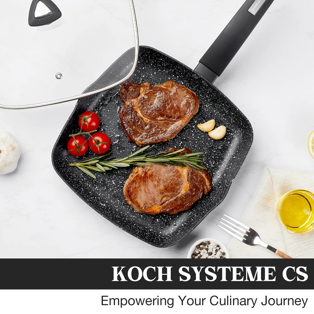 Eco-Friendly & Easy to Clean - KOCH SYSTEME CS grill pan interior & exterior is coated by high performance non-stick granite stone coating,Cooking with little oil for healthy diet and super easy to clean. Smokeless, green & healthy, very durable surface, great non-stick effect, ideal for using on low to medium heat.