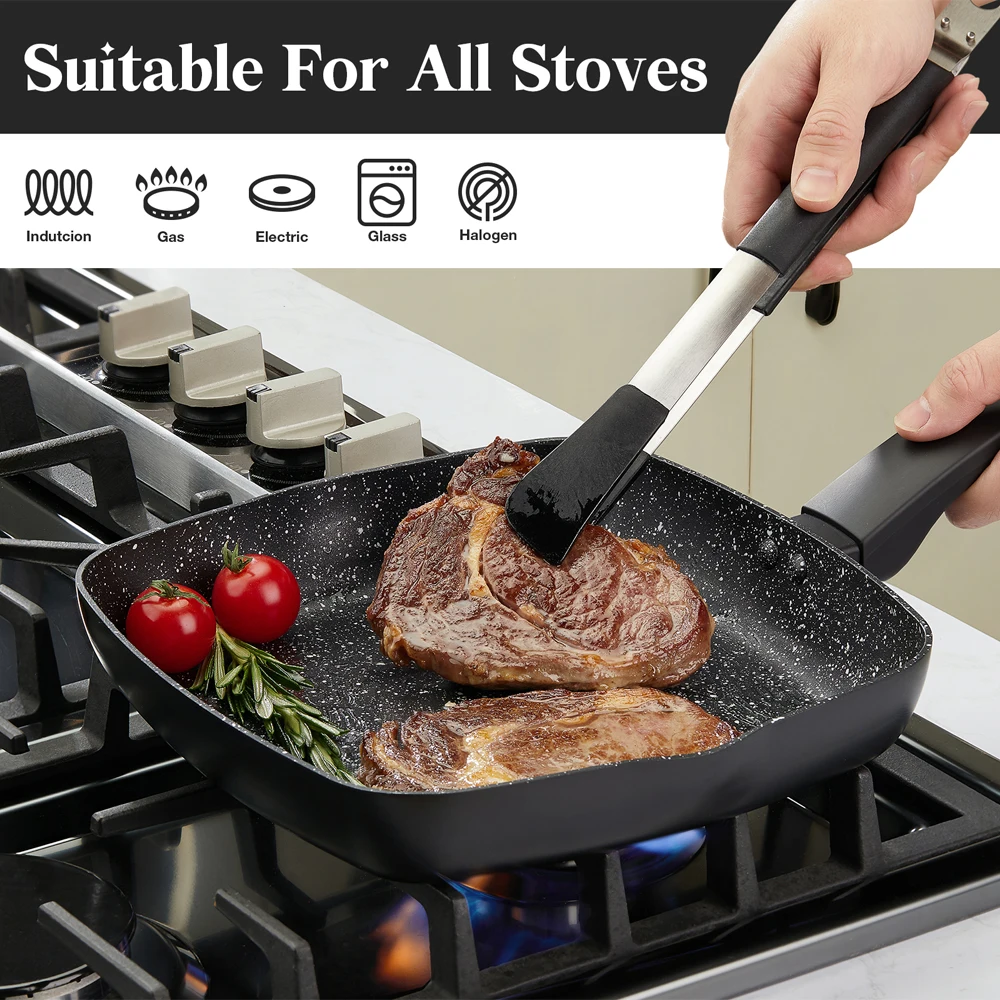 Fast Heated - Break resistant & does not warp, conducts heats quickly & evenly, the thickened magnetic bottom is compatible to provide a stable heat distribution and rapidly heating up, saves time and energy, It ensures uniform heat dissipation and prevent hot spots. The grill pan is compatible for gas, ceramic, electric, halogen or induction stoves. Oven and dishwasher are not applicable.